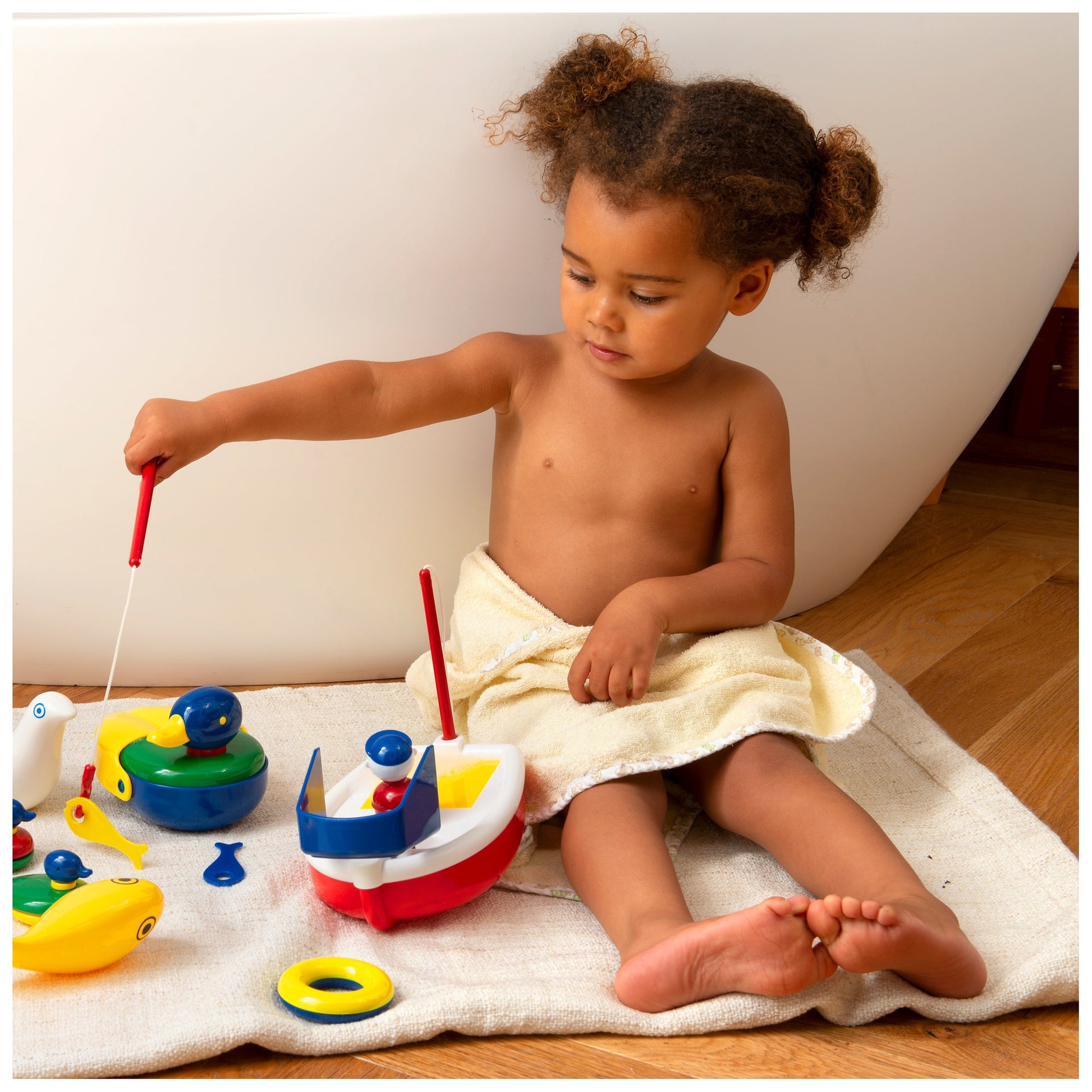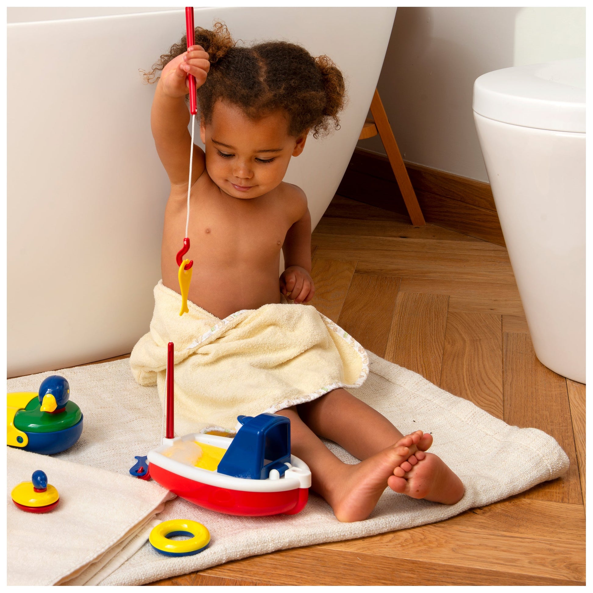 A special fishing boat for non-stop bath time fun. The steering wheel doubles up as a life ring in case the captain falls overboard, the masts become a fishing game for two and all the little fishes can be stored underboard in a secret hatch.Awarded 'Recommended' status by the Good Toy Guide. Length 21cm