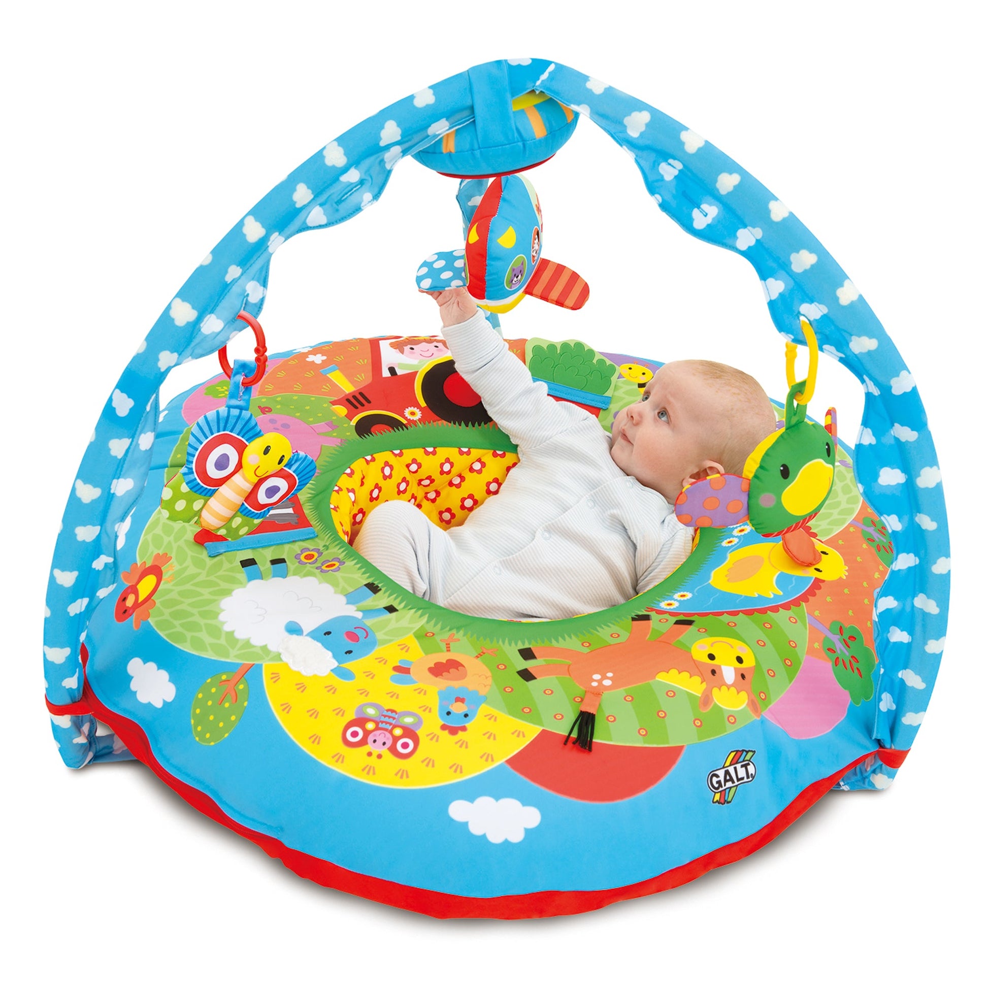 A soft multi-sensory environment with a fun farm scene around the Playnest® and the Gym as the sky above. Playnest® is a fabric covered inflatable ring that supports baby during play. There are textures and sounds to explore in the 4 Gym toys and the 8 activities around the Playnest® . Both hand/eye coordination and manipulative skills are encouraged and Playnest® & Gym will play an important role in baby's physical and play development. The Playnest®/Gym covers and soft toys are machine washable.