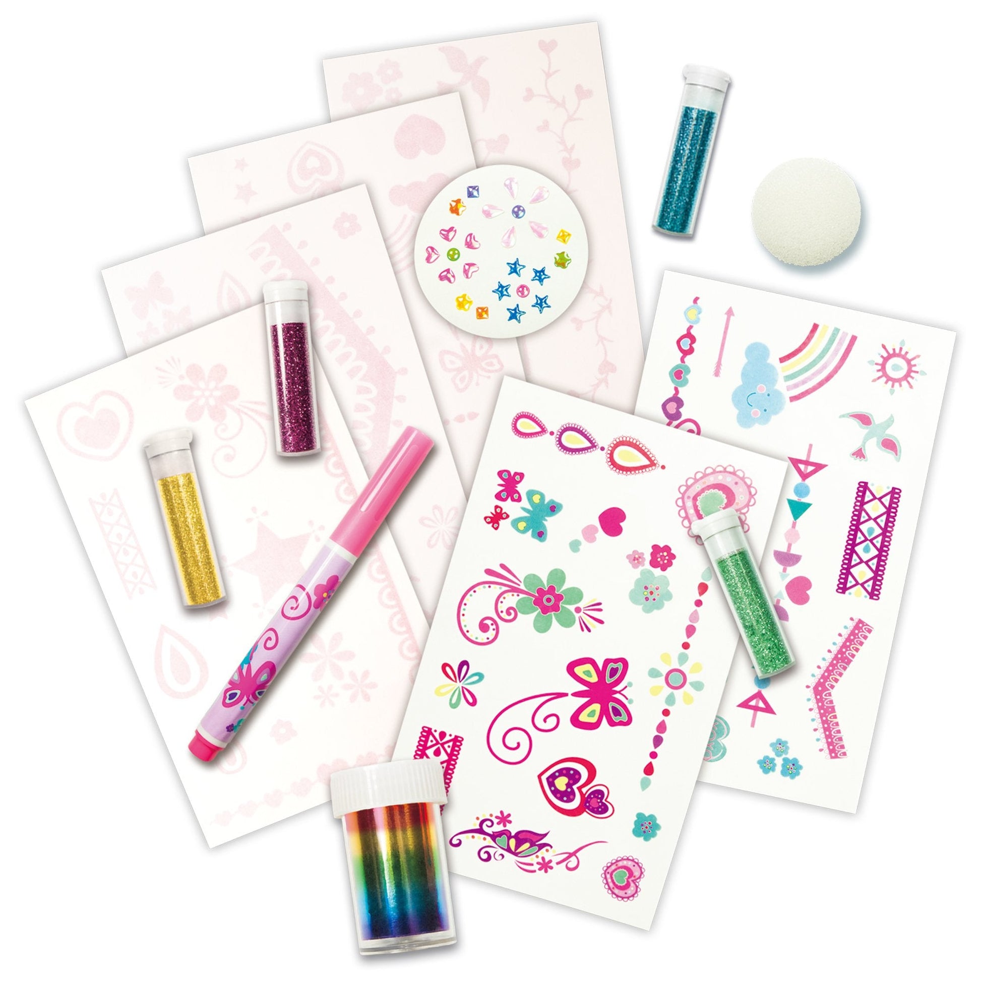 Contents: 4 glitter shaker tubes and rainbow tattoo foil with 4 sheets of sticky tattoo transfers, 2 sheets of glitter tattoo transfers, pink body art marker, stick-on gems, sponge and guide.