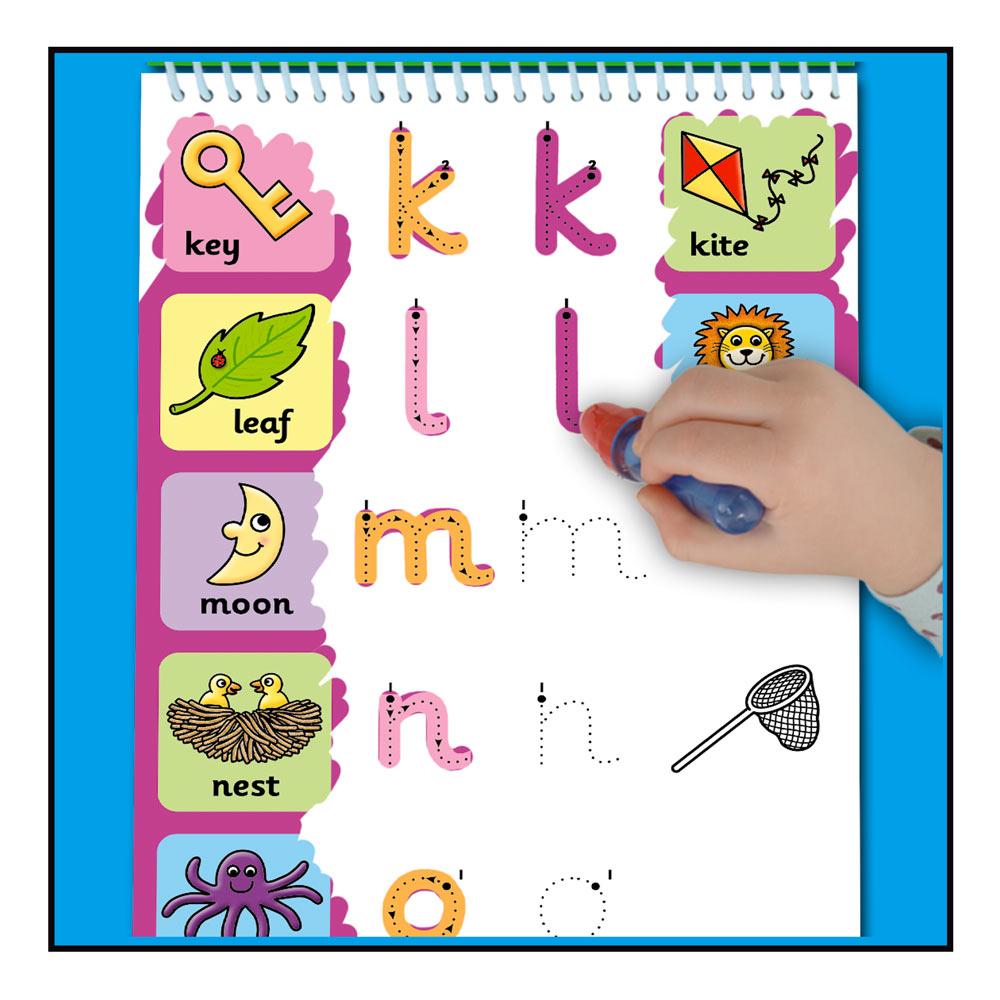 A fun way to develop writing skills and learn the alphabet with 6 reusable boards. Use the water pen to form the letters of the alphabet following the dotted lines and see the coloured letters appear. Then reveal two pictures with words that begin with the letter. The letters, pictures and words will appear and later disappear over and over again.